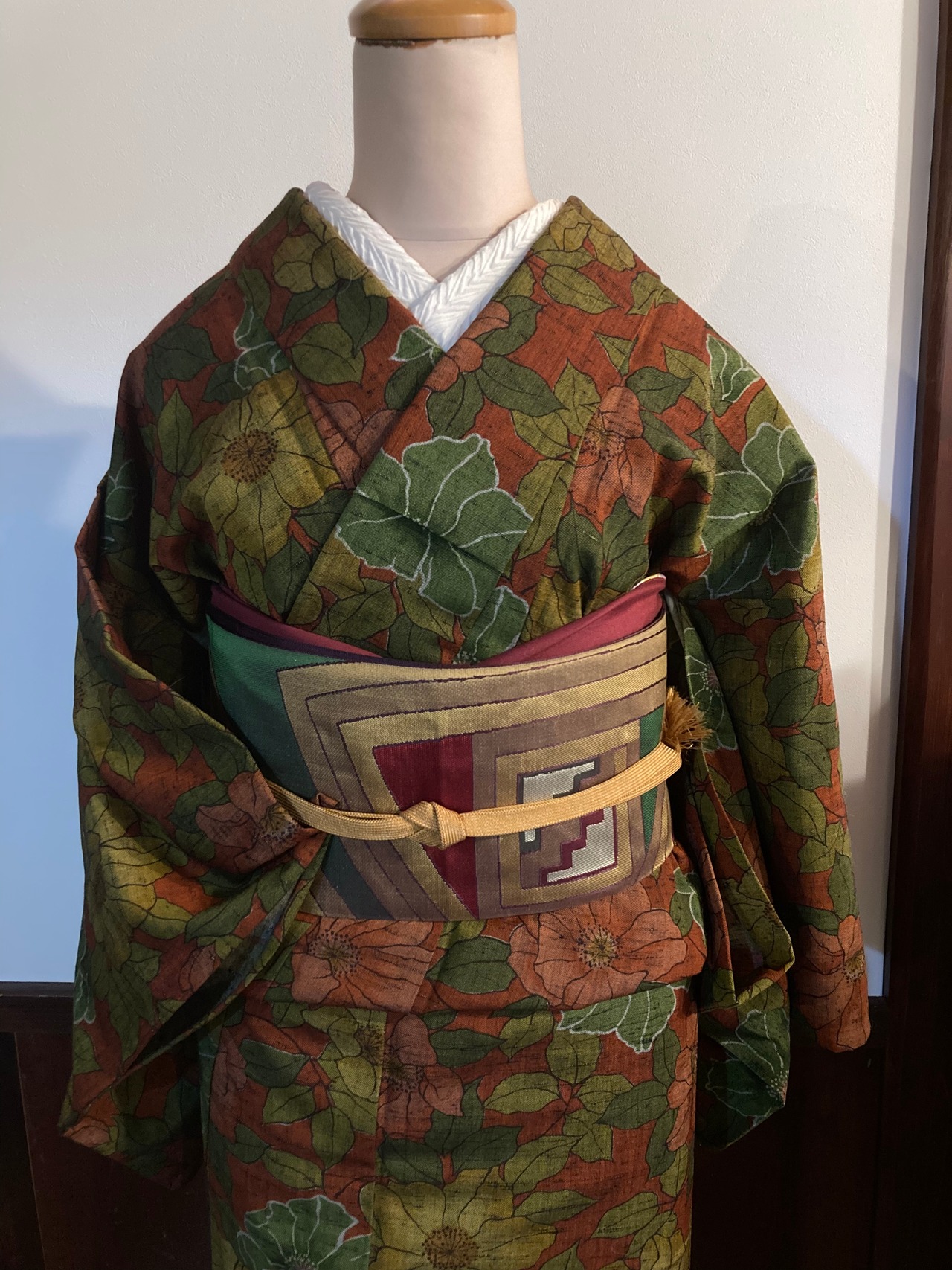 シックな大人カラーの花柄のウール着物です。