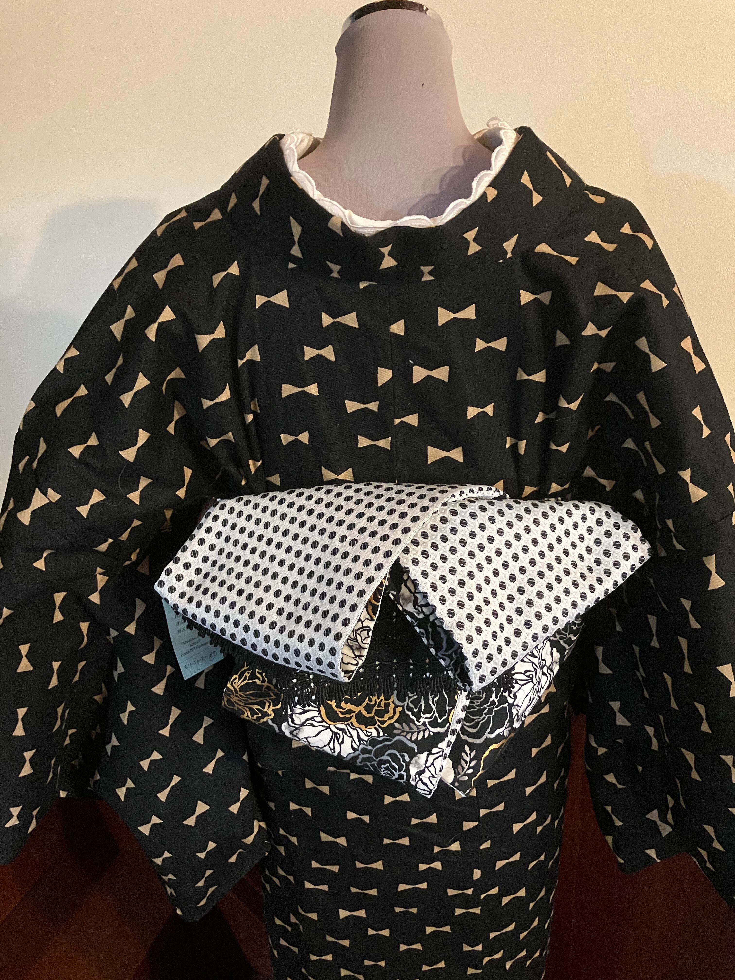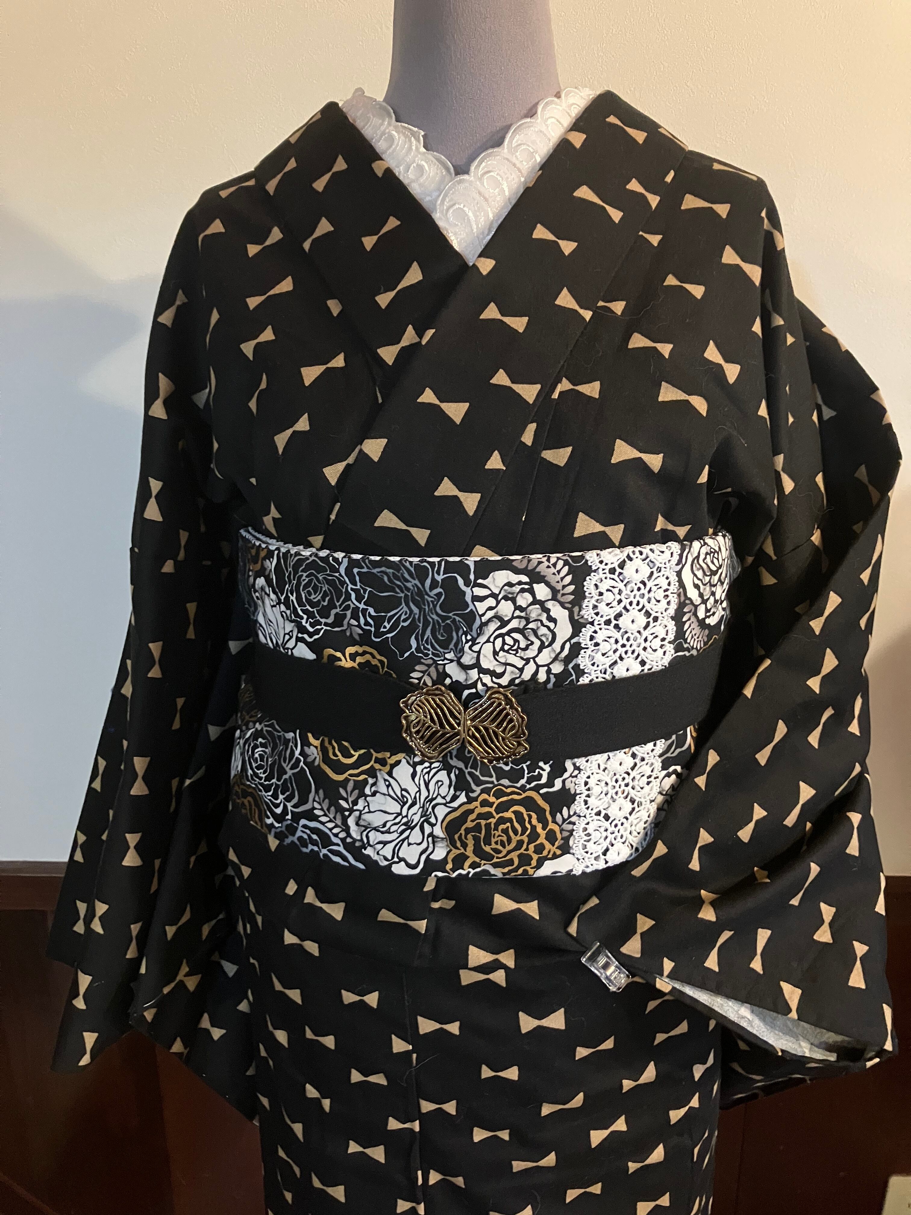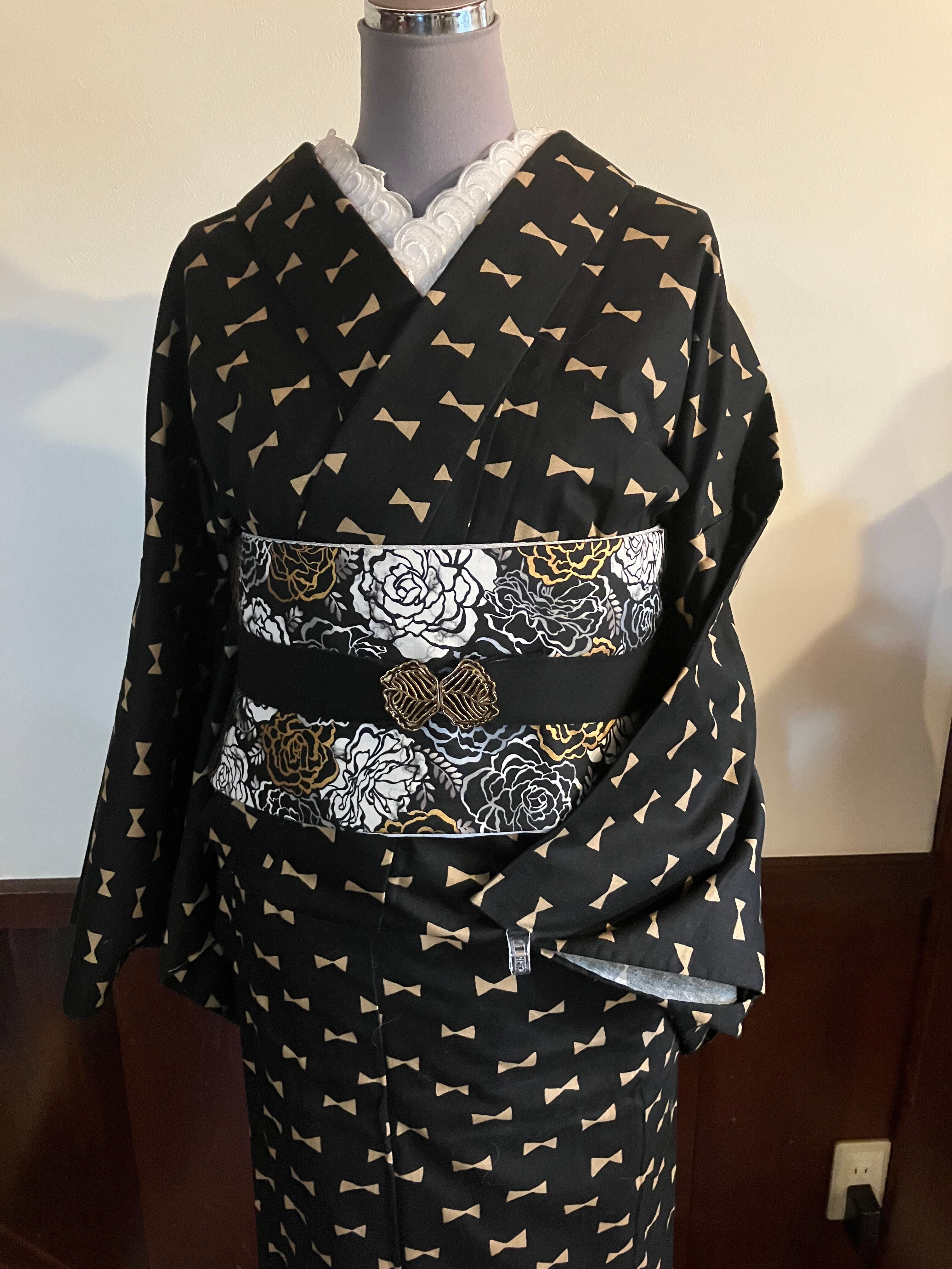 モノトーンにゴールドの薔薇とモノトーンのドット半幅帯