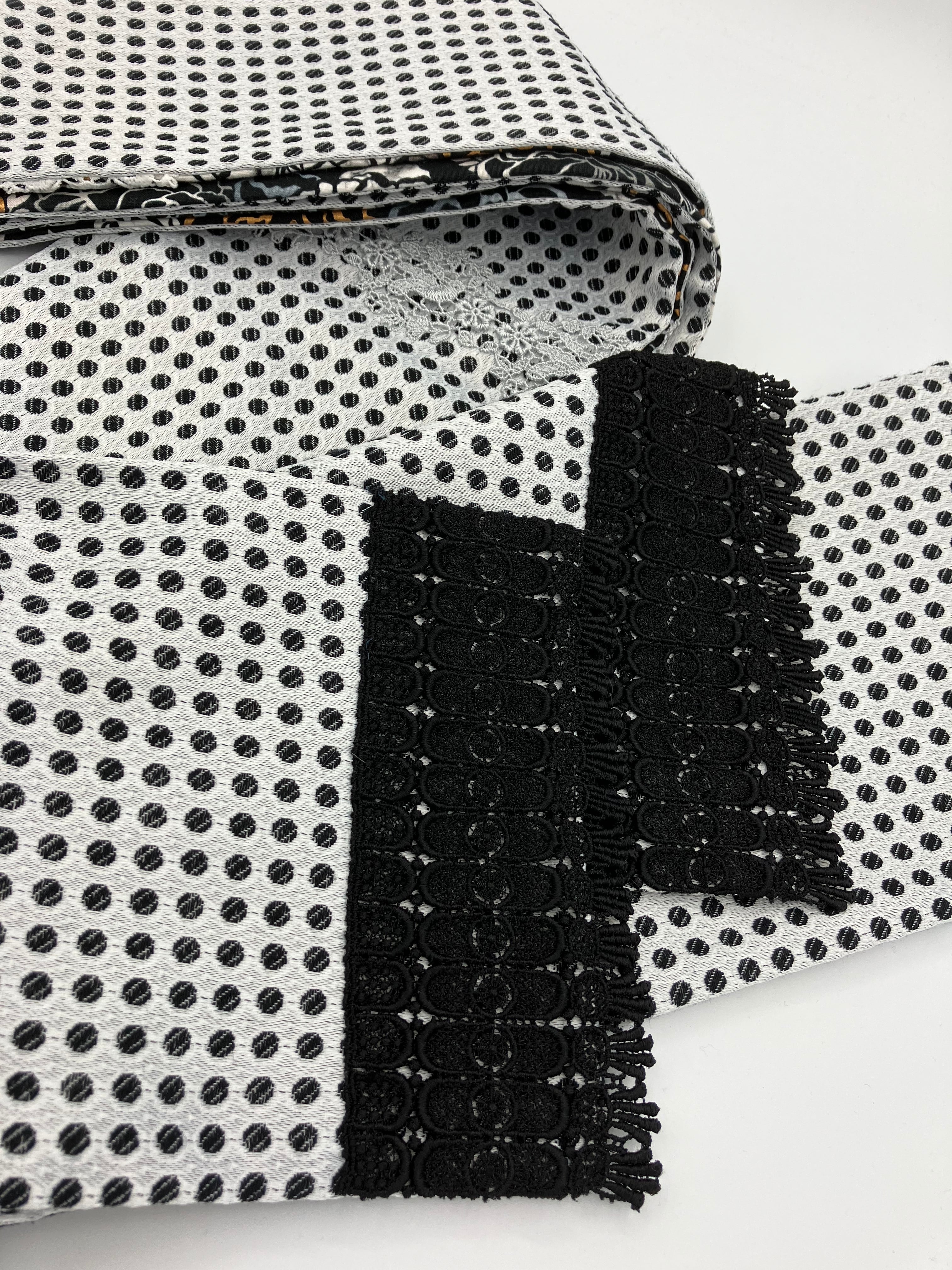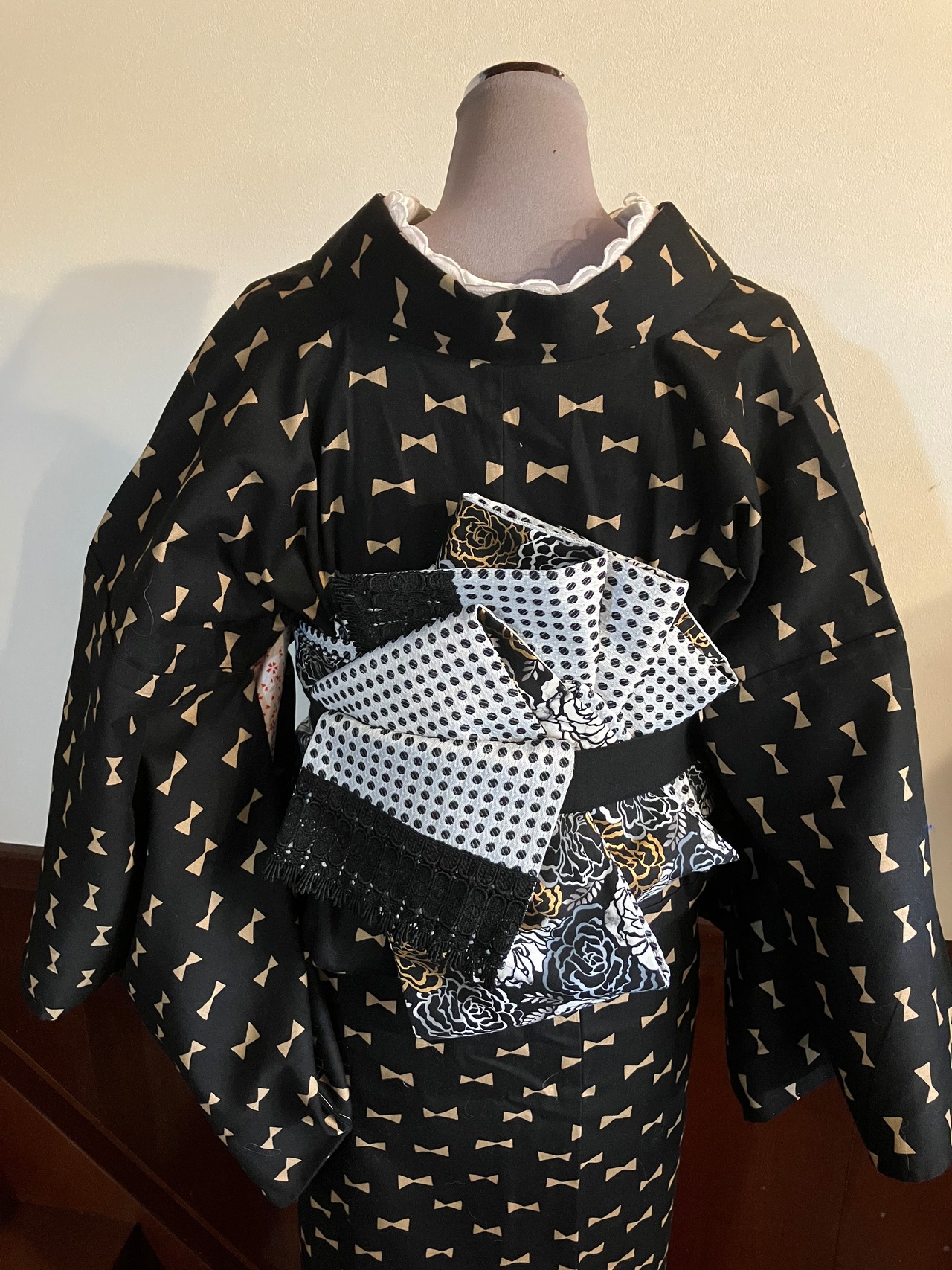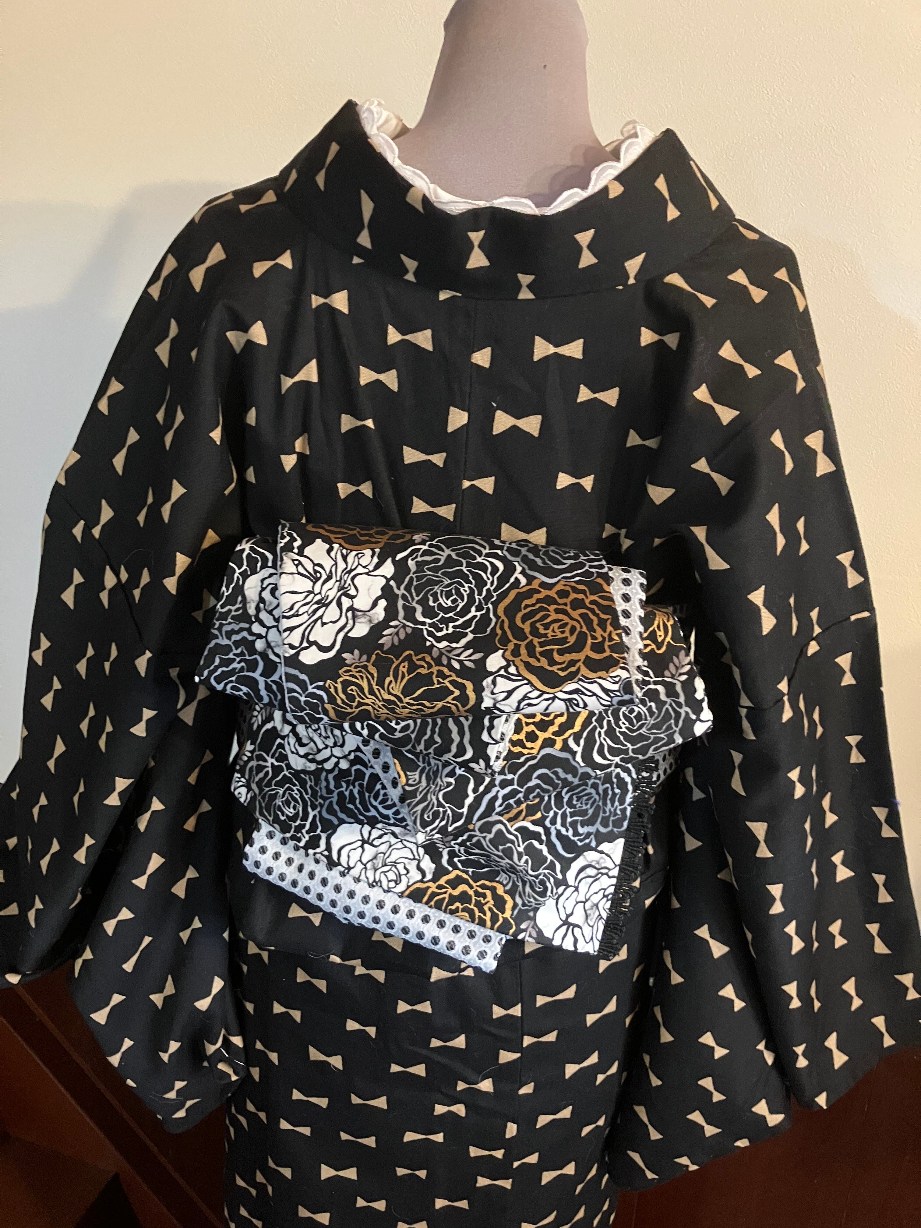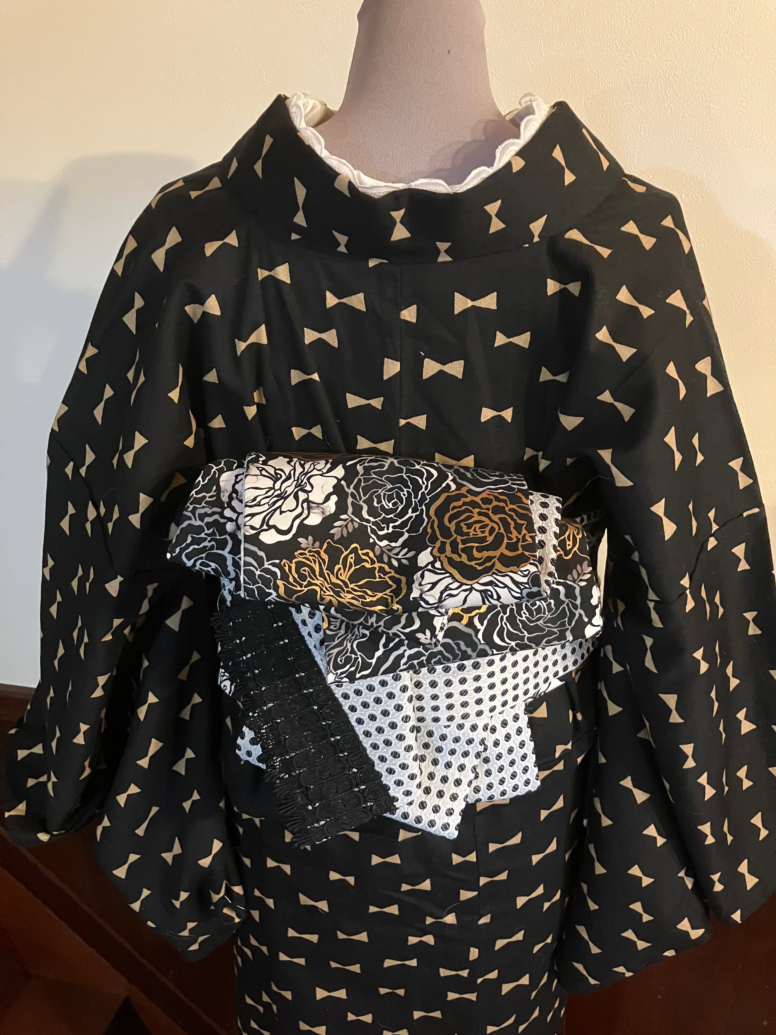 モノトーンにゴールドの薔薇とモノトーンのドット半幅帯