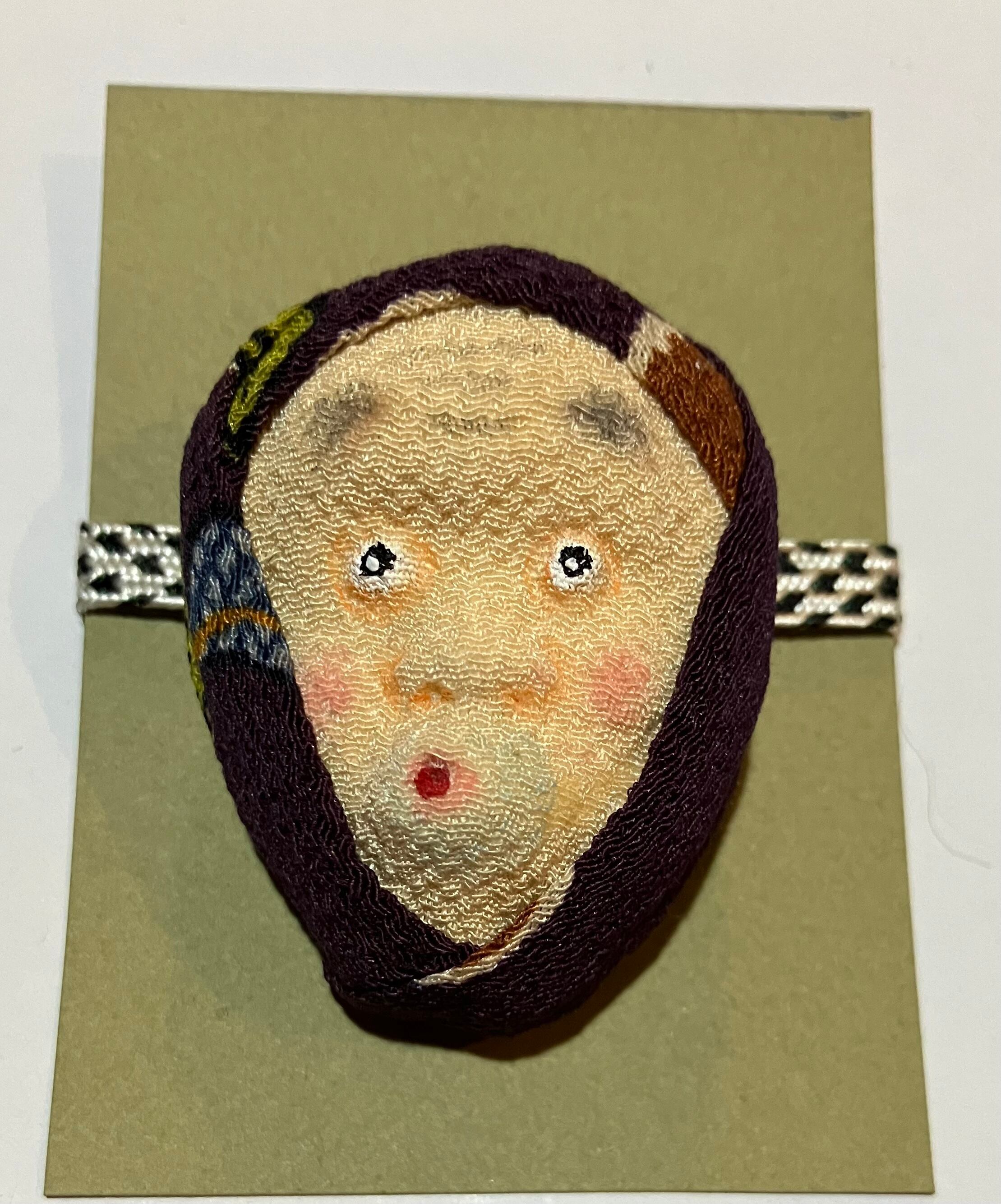 古布の縮緬を使用して一つ一つ手作りされた帯留になります、一点一点表情も違い、かぶりものも違います。