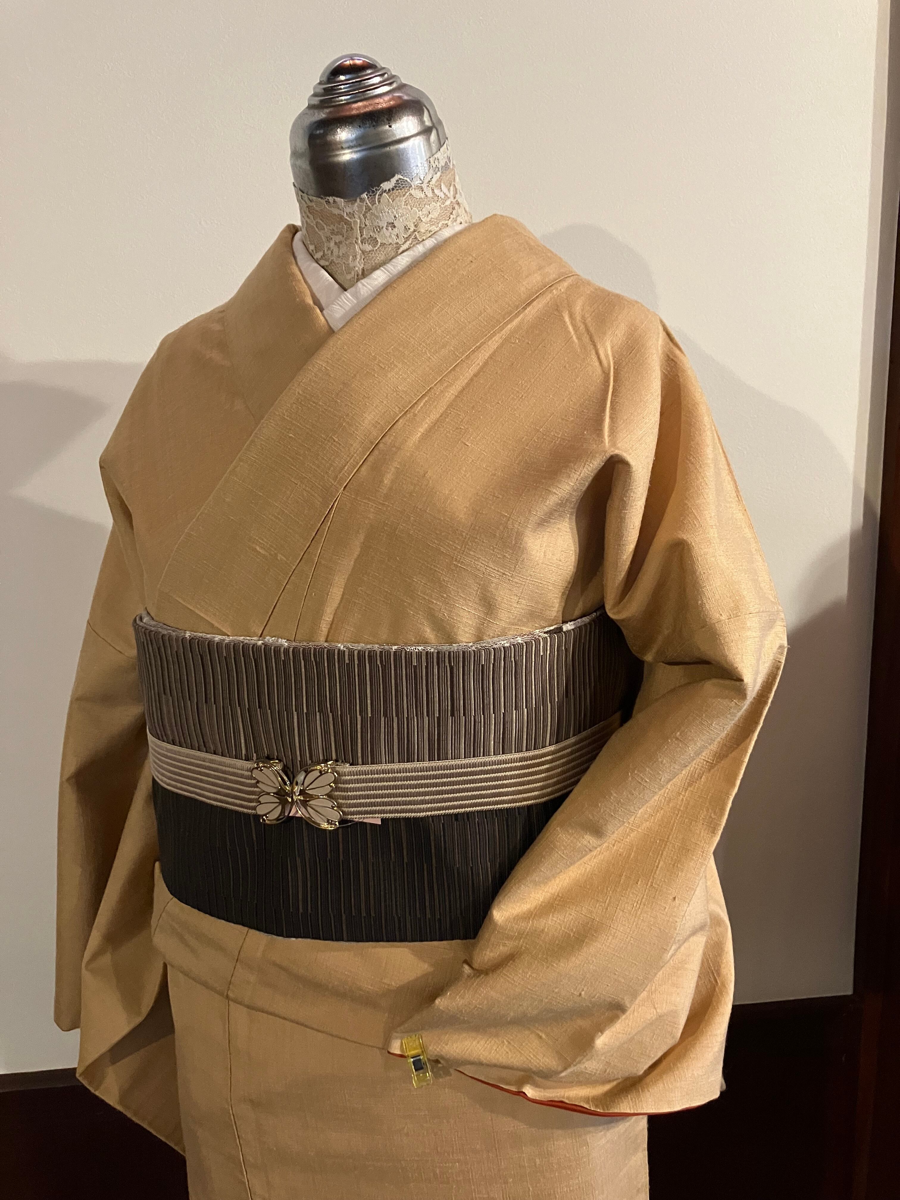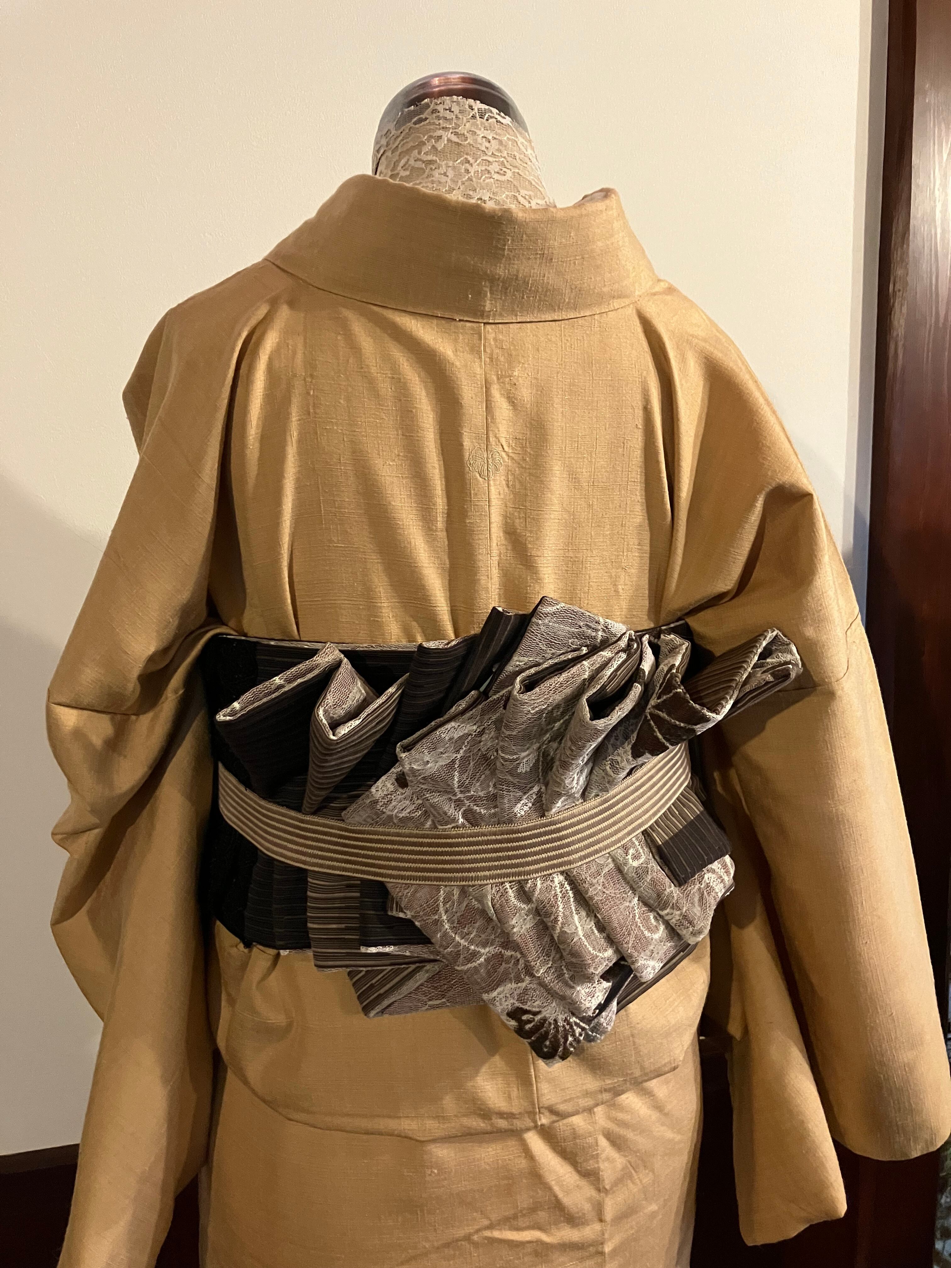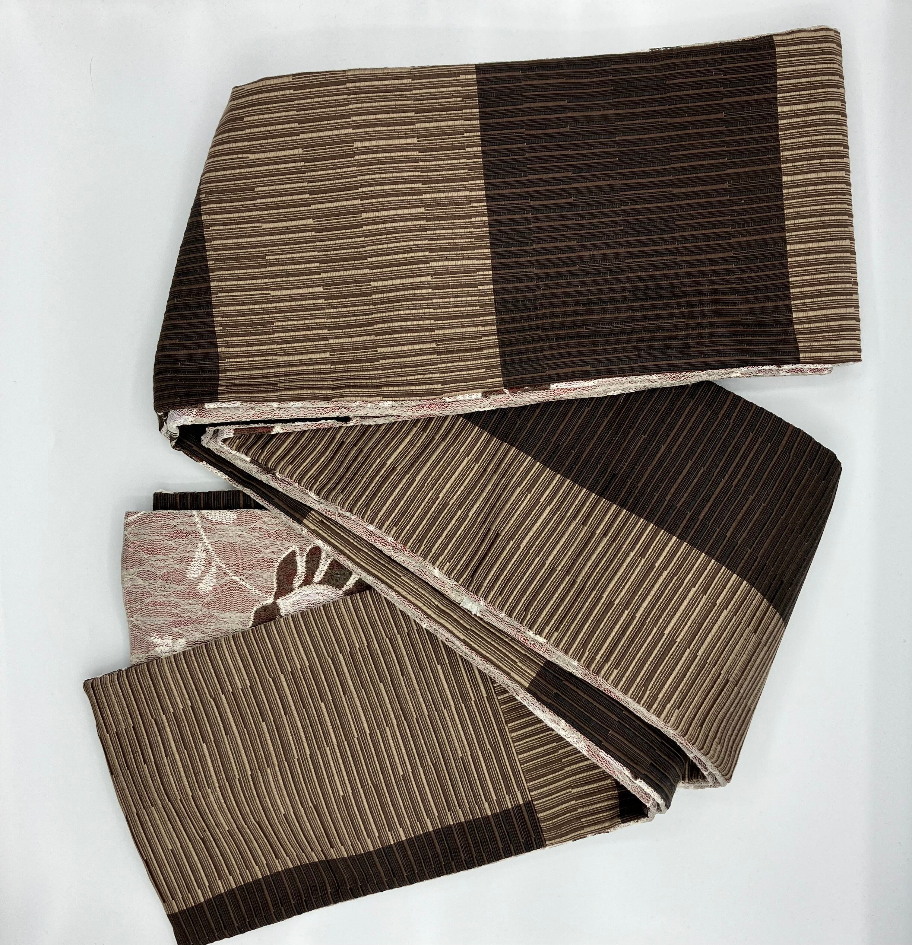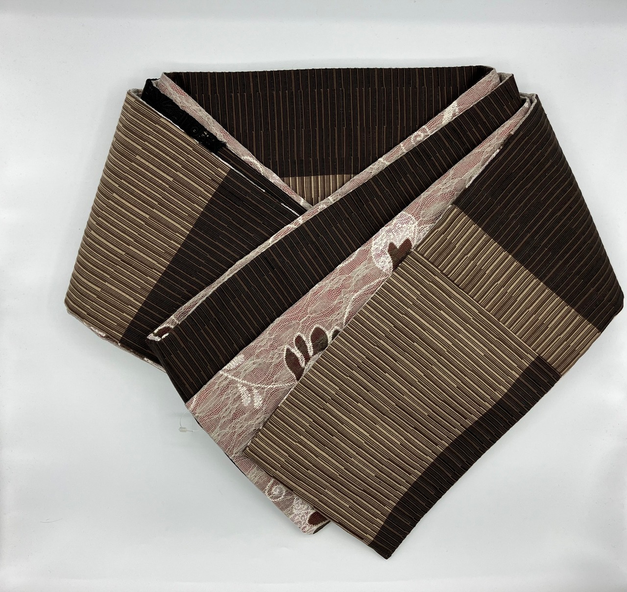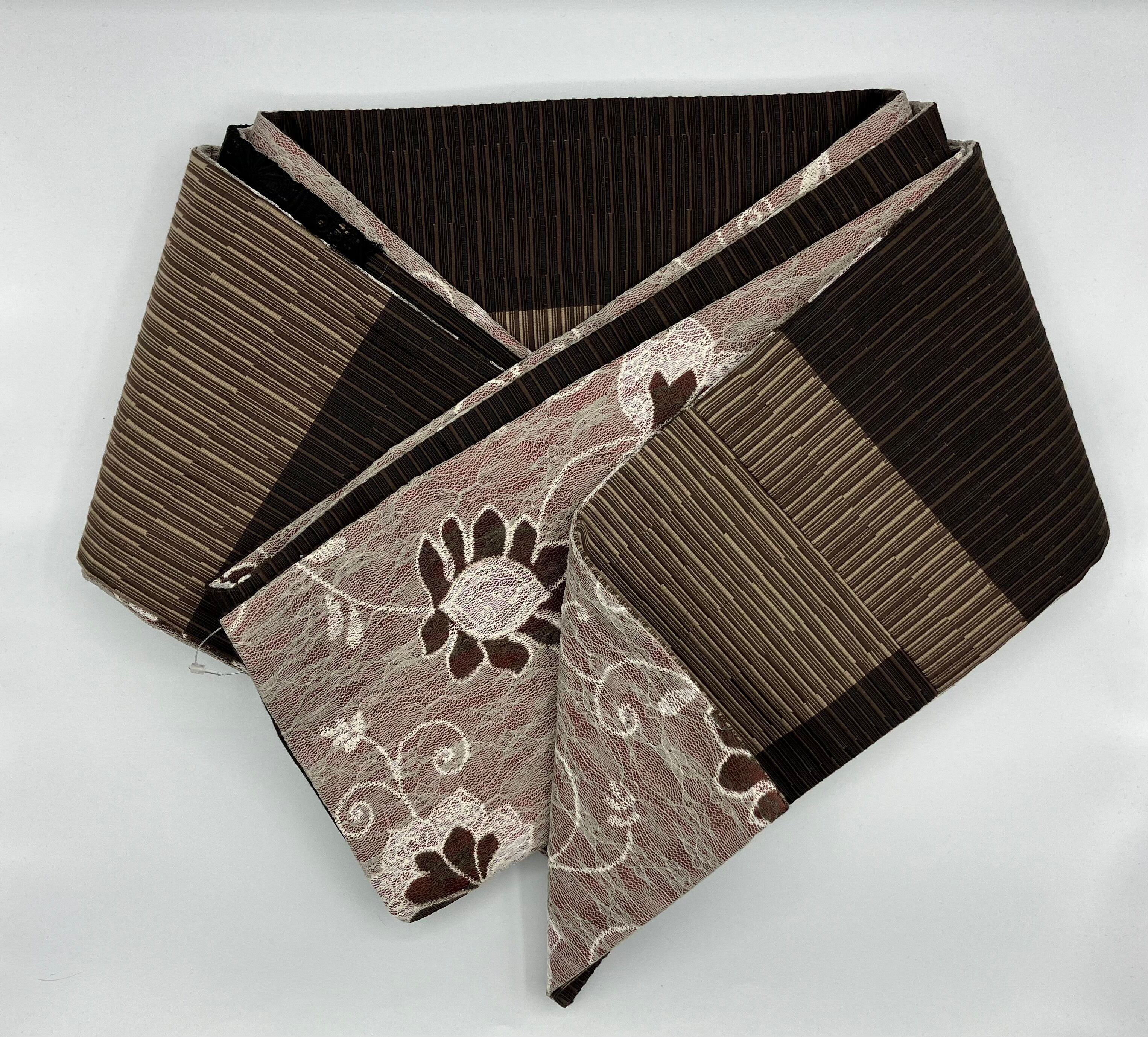 ワイン色の帯皮を芯に入れて、ベージュベースのお花のレースを掛けた面に反対側シックな織の縞を縦横に配置して、色んなイメージを楽しめる帯に仕上げました。