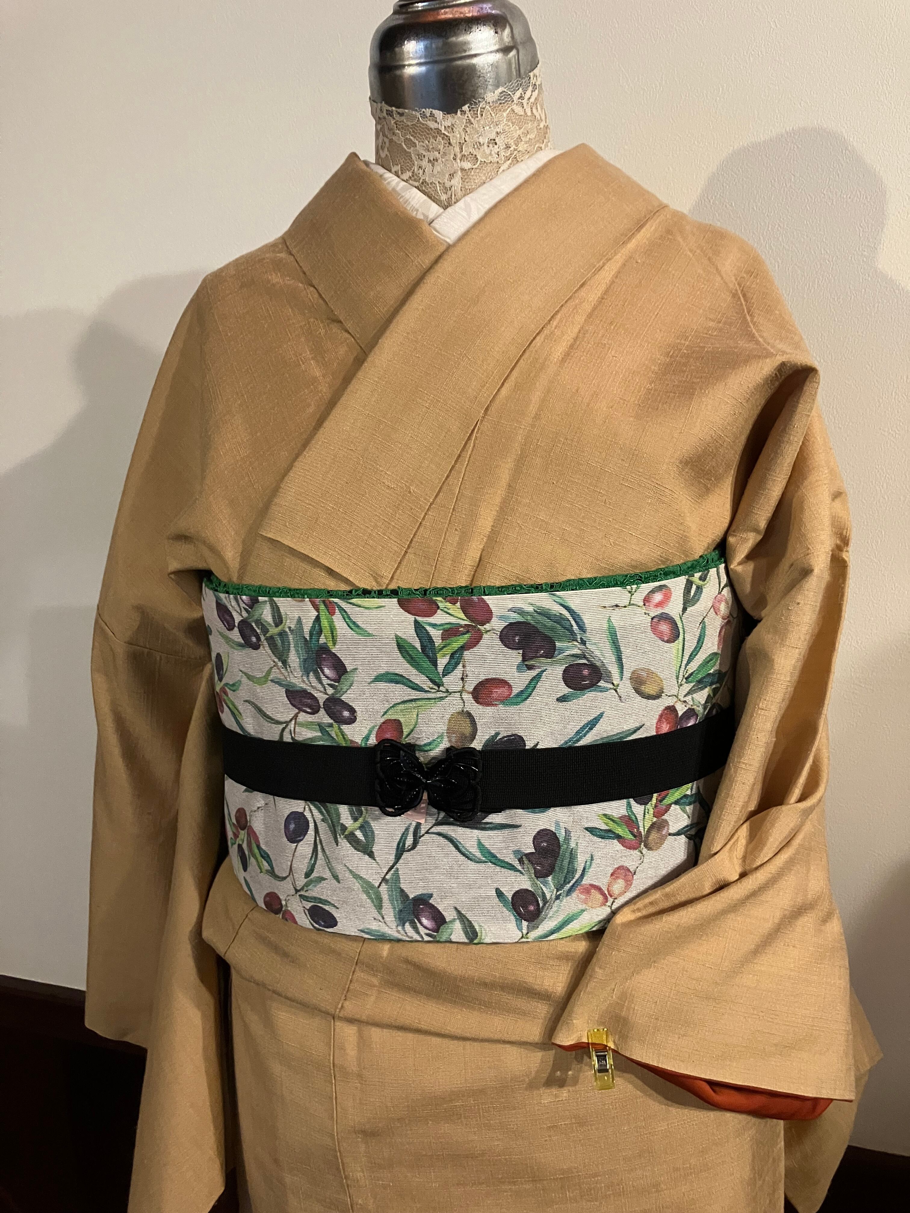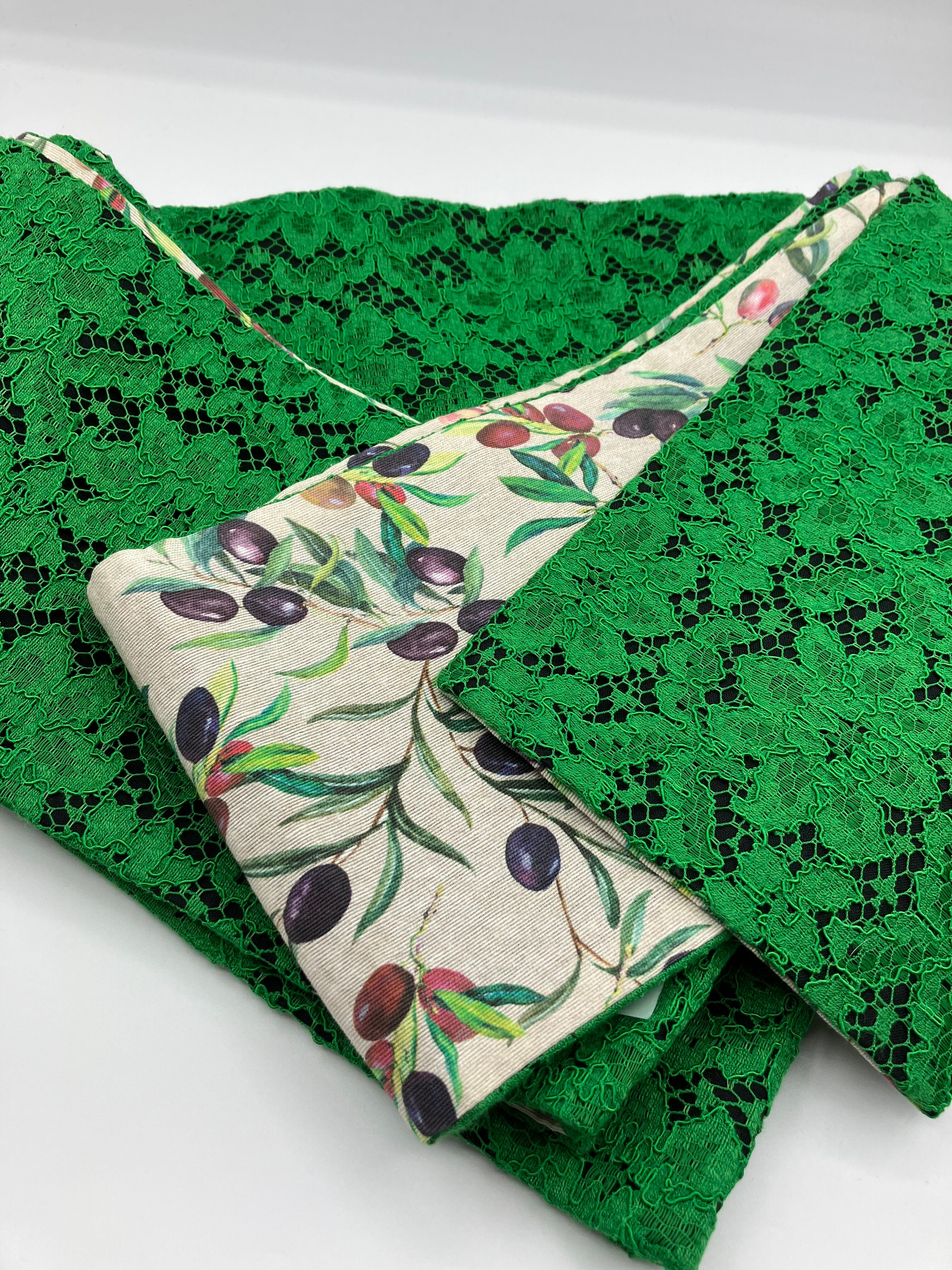 ポルトガルファブリックらしい、植物図鑑のようなオリーブがとっても印象的な面に、黄緑寄りの緑のレースを合わせました。