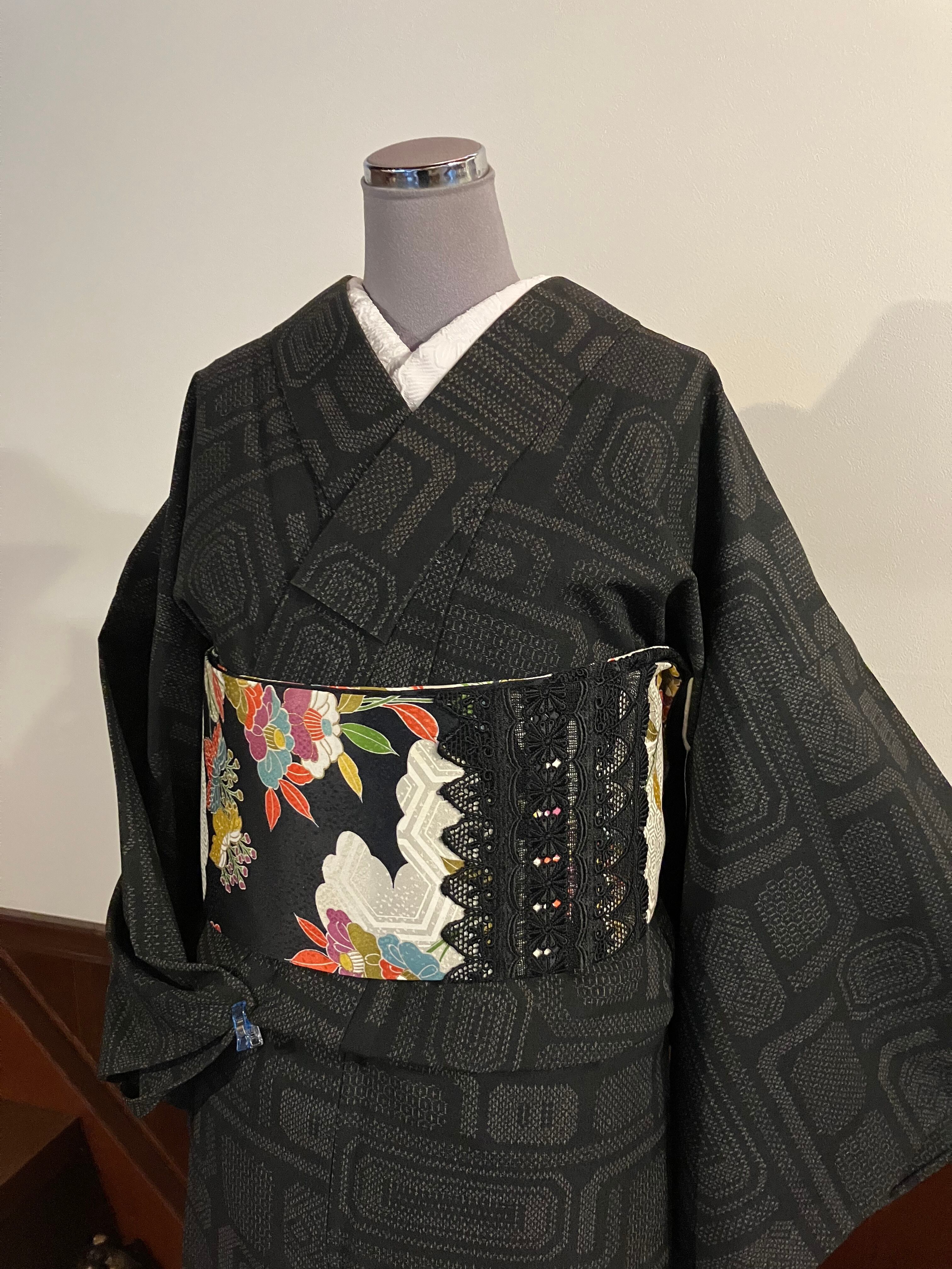 黒 椿小紋リメイク半幅帯